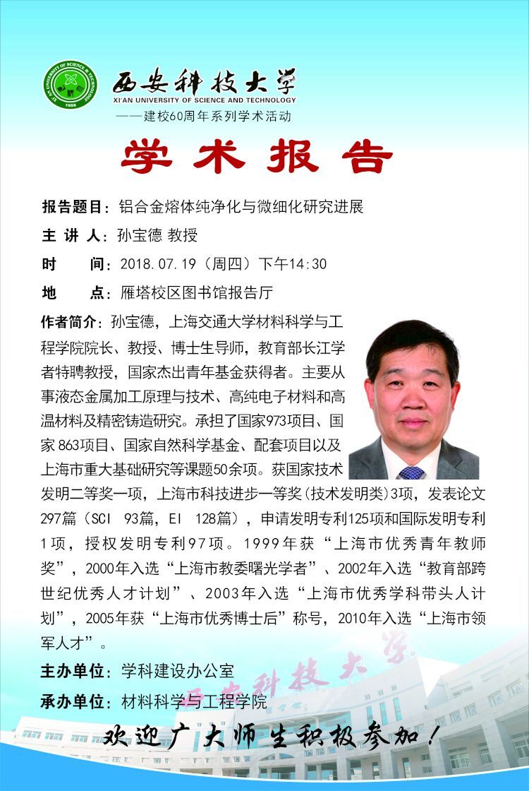 【学术报告预告】铝合金熔体纯净化与微细化研究进展----建校60周年系列学术活动